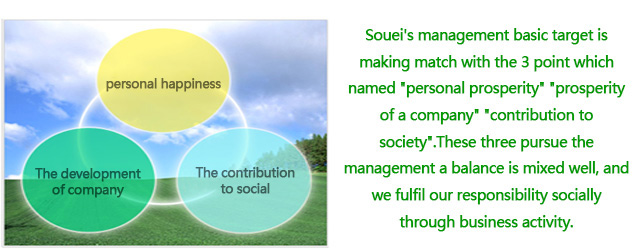 Souei’s basic objectives of the business are to pursue the harmonious development of "personal ±happiness", "company prosperity" and "contribution soc♦iety".We pursue three aspects of the integration of the busine∑ss, through our business activities to complete social responsibility.